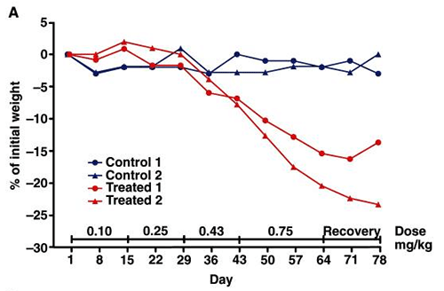 Рис. A. Процент потери веса в контрольных группах (синий) по сравнению с теми, кто лечился адипотидом (две разные дозы, показаны красным).