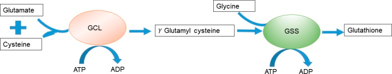 Глутатион находится как внутри клеток, так и в качестве секретируемого вещества во внеклеточном матриксе. Он обнаружен в очень высоких концентрациях в легочной ткани, мозге и печени. Он синтезируется в организме человека посредством простой окислительно-восстановительной реакции следующим образом.