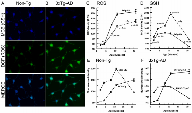 На графике выше показаны уровни ROS или свободных радикалов в результате уровней глутатиона у стандартных мышей по сравнению с мышами, которые были генетически модифицированы для того, чтобы быть склонными к болезни Альцгеймера (БА). Это показывает две вещи о глутатионе. Во-первых, это показывает, что БА имеет окислительный компонент. То есть, по-видимому, по крайней мере часть риска развития БА сводится к дефектному устранению свободных радикалов в центральной нервной системе.