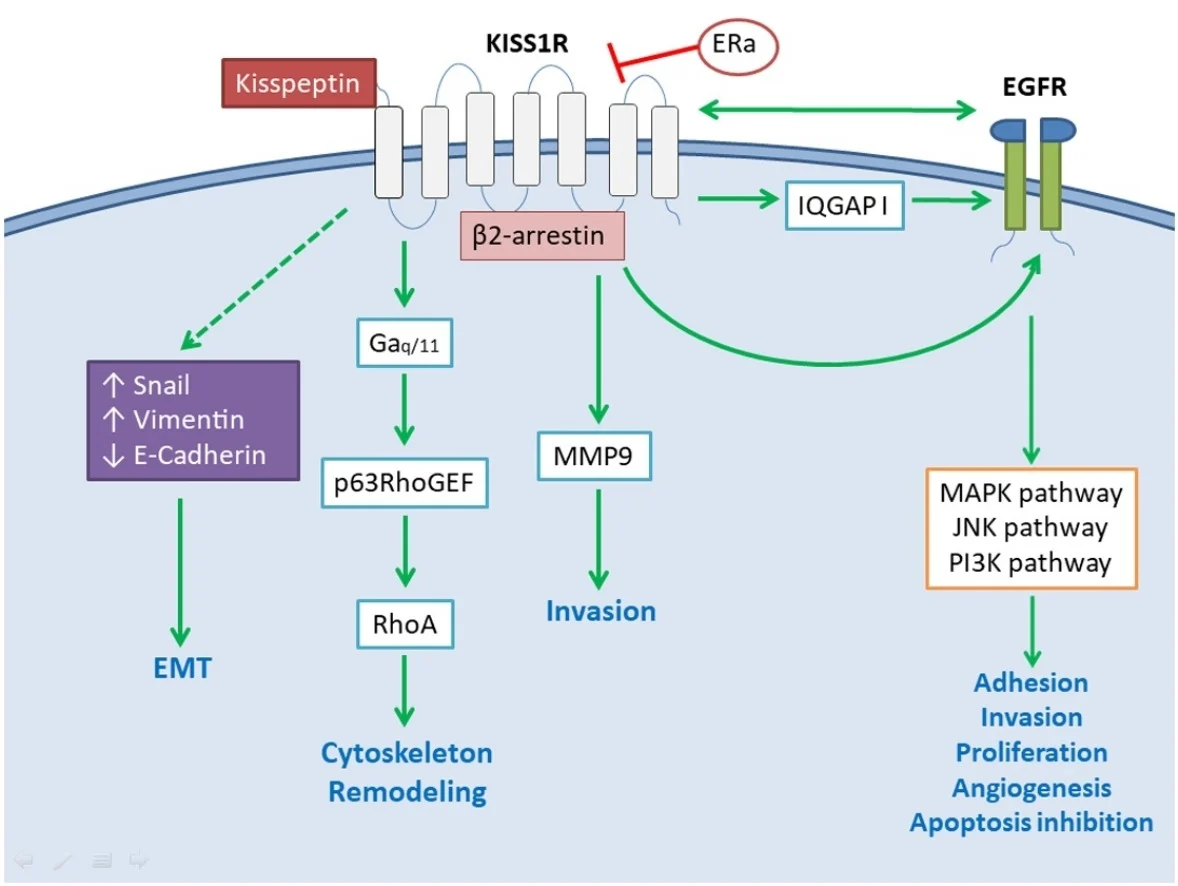 Двадцать лет назад было обнаружено, что кисспептин способен подавлять метастазы меланомы (злокачественного рака кожи) на целых 95%. Похоже, что пептид производит этот эффект, уменьшая миграцию раковых клеток. Также есть некоторые сомнения относительно того, может ли кисспептин уменьшать клеточную адгезию и тем самым предотвращать прилипание раковых клеток к другим тканям и их вторжение. Скрининг различных типов метастатического рака показывает, что при раке груди, мочевого пузыря, ЖКТ, простаты, поджелудочной железы, яичников, кожи и щитовидной железы наблюдаются изменения (в целом снижение) уровней кисспептина, что подтверждает, что пептид играет роль в распространении рака[4].