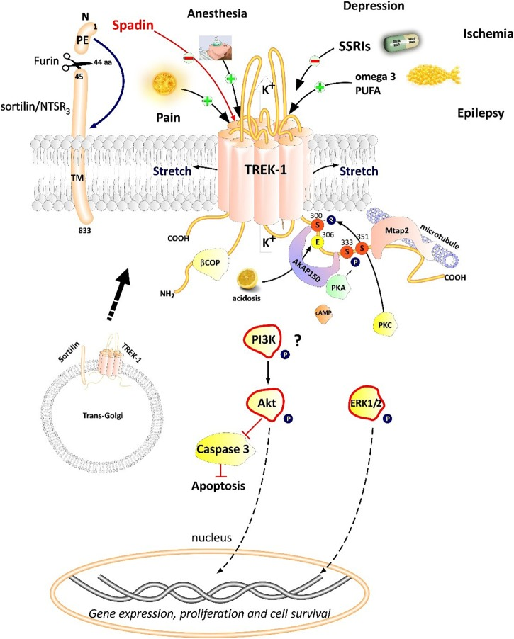 Рецептор, с которым в первую очередь связываются спадин и, следовательно, PE-22-28, — это TREK-1. TREK-1 — это двухпоровый калиевый канал, регулируемый рядом различных молекул. Он принадлежит к большому семейству двухпоровых калиевых каналов, которые важны для регуляции возбудимости нейронов. TREK-1, в частности, находится в областях мозга, контролирующих настроение, память и обучение. К этим областям относятся префронтальная кора, миндалевидное тело и гиппокамп. Стимуляция активности TREK-1 снижает возбудимость нейрона, в то время как снижение функции TREK-1 повышает возбудимость и увеличивает вероятность события деполяризации[3]. Снижая возбудимость нейрона, TREK-1 может помочь защитить от эксайтотоксичности.