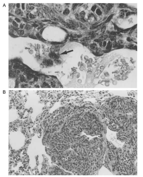 Рис. 8. Опухоль яичника. H&E. А, х800. Б, х200. А – гранулезно-клеточная опухоль. Стоит обратить внимание на инвазивное размещение опухолевых клеток в кровеносном сосуде (стрелка). Б – метастазирующая опухоль в легких [12].
