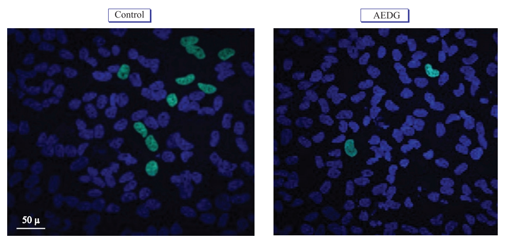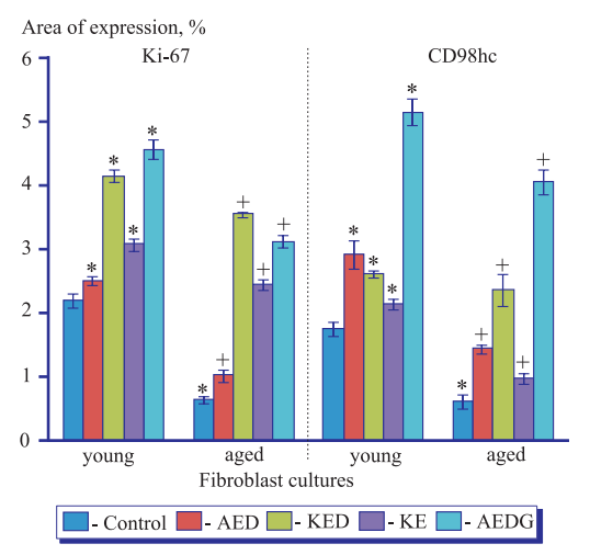 Сначала ученые в работе [5] оценили влияние коротких пептидов на скорость деления фибробластов кожи в процессе ее старения. Этот параметр был определен количественно с помощью маркера Ki-67. В контроле экспрессия Ki-67 в молодых культурах в 3,48 раза превышала соответствующий показатель в старых культурах. Пептиды AED, KED, KE и AEDG увеличивали экспрессию Ki-67 в молодых культурах в 1,14, 1,89, 1,40 и 2,08 раза соответственно, а в старых культурах – в 1,60, 5,61, 3,87 и 4,94 раза соответственно (рис. 1).