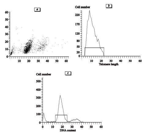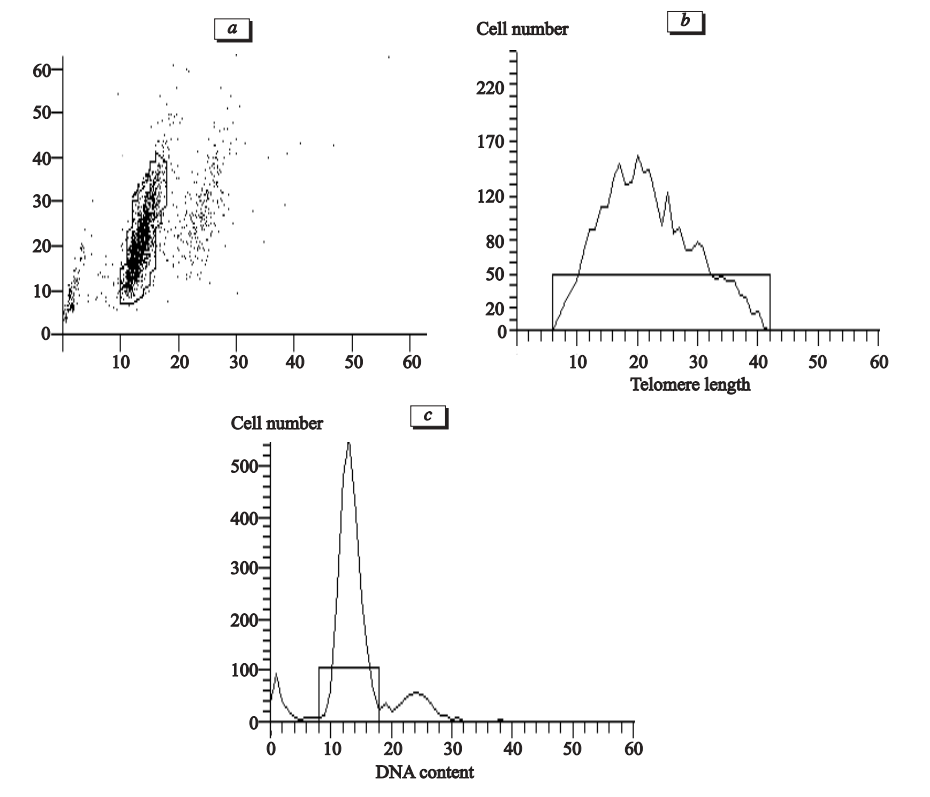 Окрашивание клеточной ДНК йодидом пропидия (линейная шкала); по оси ординат: пептидно-нуклеотидное окрашивание теломер (линейная шкала). Клетки в фазе G1 клеточного цикла обведены; б) гистограмма распределения клеток по длине теломер в фазе G1 клеточного цикла; в) гистограмма распределения клеток по содержанию ДНК в фазе G1 клеточного цикла [6].