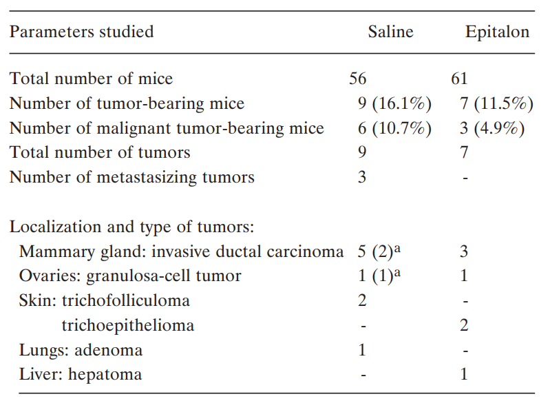 Это исследование показало, что эпиталон уменьшает количество мышей со злокачественными опухолями и предотвращает метастазирование спонтанных опухолей в репродуктивные органы мышей. Противоопухолевый эффект Эпиталона оказался таким же, как и у его природных аналогов.