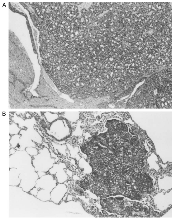 Рис. 7. Опухоль молочной железы. H&E. x80. А – инвазивная протоковая карцинома. Б – метастазирующая опухоль в легких [12].