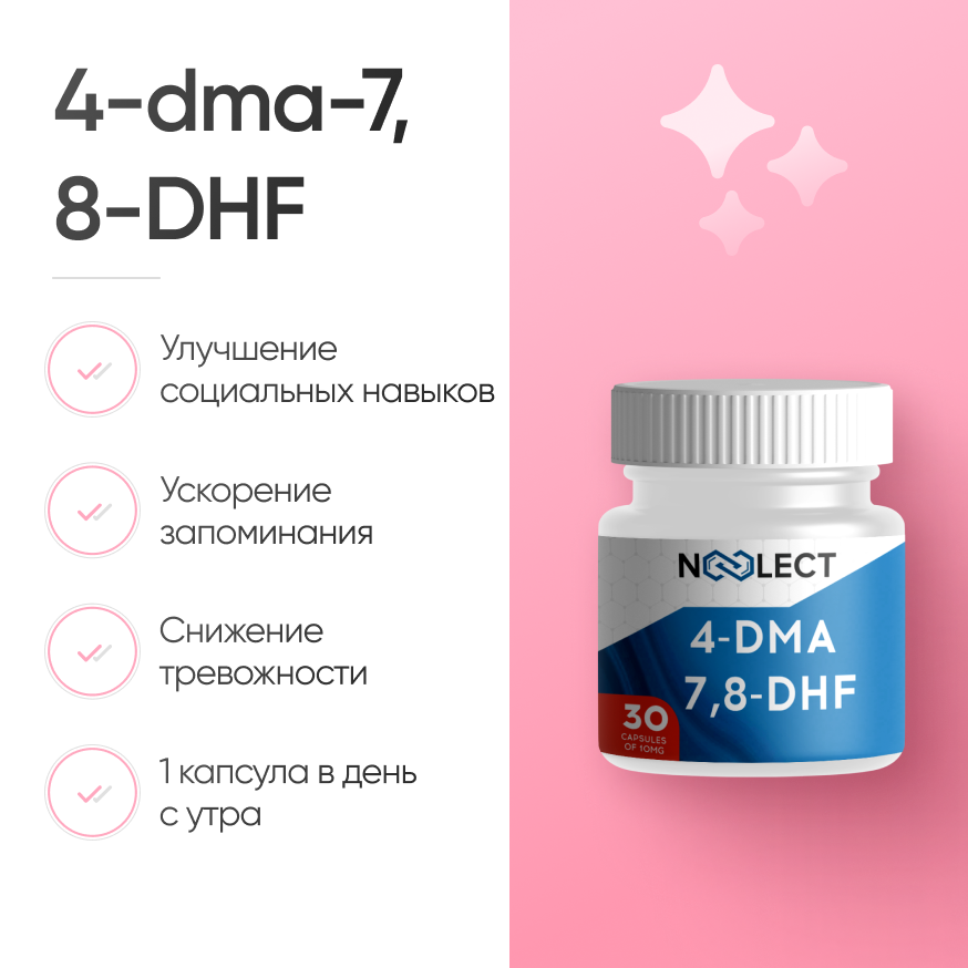 4-dma-7,8-DHF — это популярная в мире биологически активная добавка, представляющая собой ноотропное соединение, производное природного флавона 7,8 дигидроксифлавона. 4'-ДМА-7,8-ДГФ отличается от 7,8-ДГФ добавлением диметиламиногруппы в положение 4 на структуре основания флавона. Диметиламиногруппа состоит из атома азота с двумя метильными группами. Отметим, что 4-dma-7,8-DHF обладает более высокой пероральной биодоступностью, чем обычный дигидроксифлавон, но также способствует нейрогенезу, проявляя мощный антидепрессивный эффект и выступая в качестве агониста тропомиозин-рецептор-киназы B.