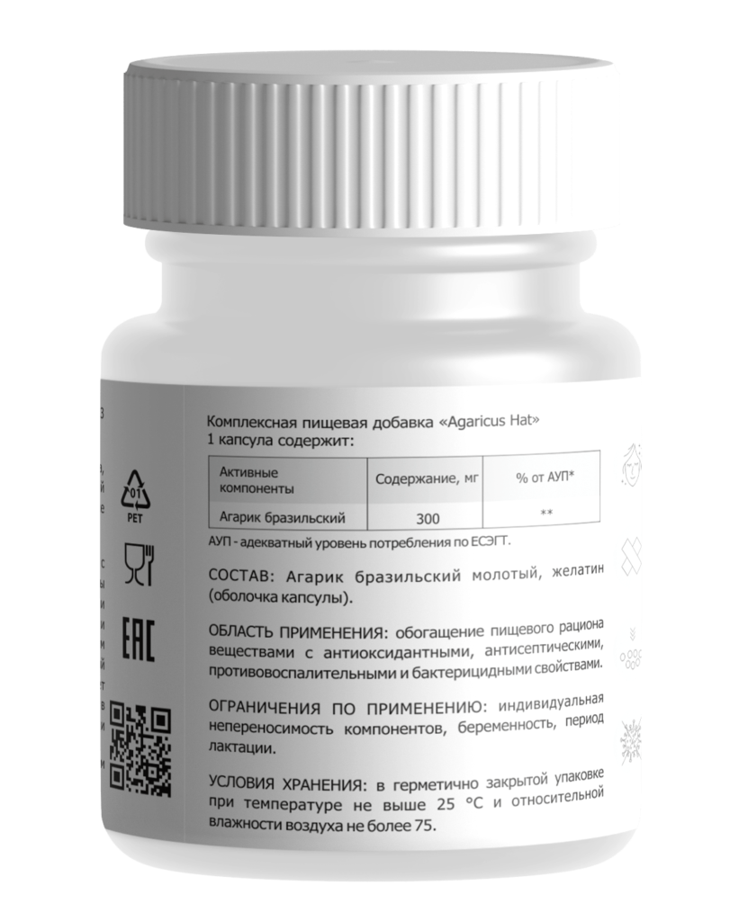 Предложенный продукт произведен фармацевтической компанией Bioeureka. Выпускается в капсулах. Эта форма наиболее удобна для использования. В состав препарата входят: экстракт молотого агарика бразильского, желатин (оболочка). Дозировка — 450 мг. В фармацевтическую банку с системой контроля вскрытия помещено 60 капсул с порошком. Делая заказ препарата на сайте или приобретая товары по телефону, нужно учитывать необходимое количество капсул на курс приема.