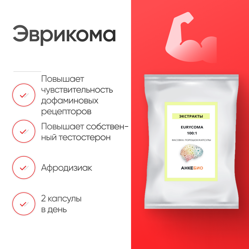 Эврикома также будет хорошо работать в качестве добавки с потенциальными преимуществами для тренировок. Соединения, содержащиеся в растении, поддерживают энергетические процессы (повышают АТФ), выносливость и эффективность тренировок. Анаболический эффект растения ускоряет набор мышечной массы.