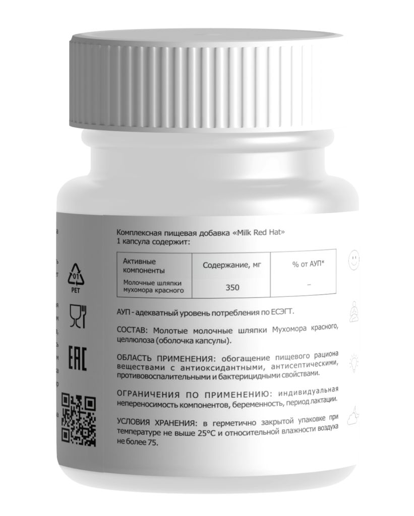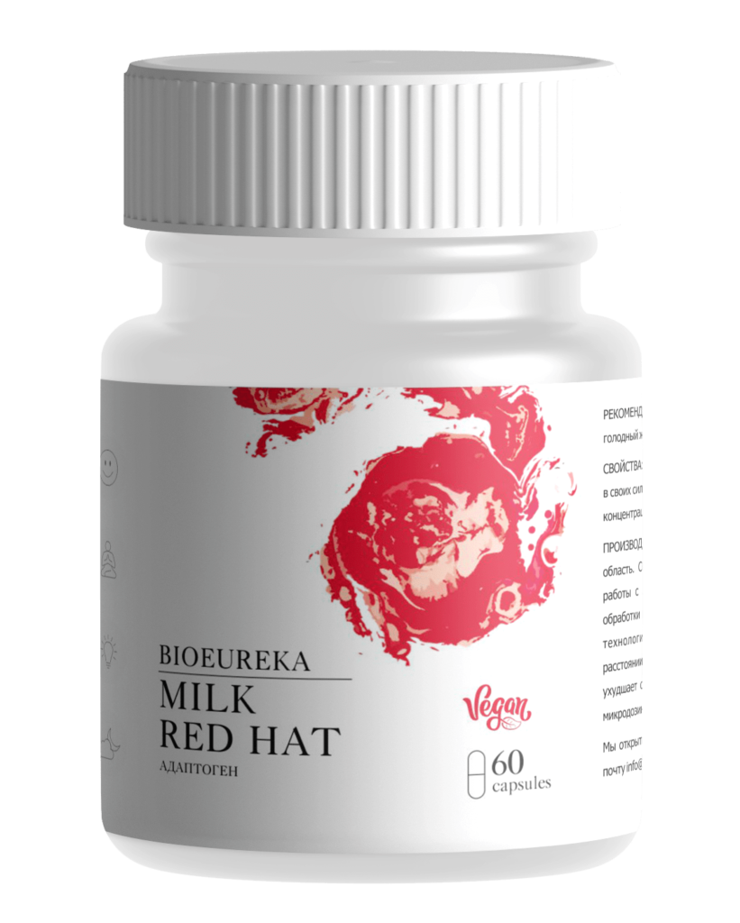 Milk Red Hat — название высокоэффективного комплекса, созданного на основе красного мухомора (Amanita Muscaria). В составе препарата используются только молочные шляпки красных мухоморов - порошок из сушеных шляпок является лекарственным и очень полезным для организма. Сырье исключительно ценное: сбор, сушка и последующая заготовка грибов возможны только в определенное время и в небольших количествах — пока сочные шляпки еще не успели раскрыться и не потеряли свои полезных свойств.