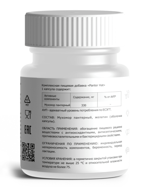 Сушеные пантерные мухоморы в капсулах предназначены для микродозинга. Каждая капсула содержит 0,33-0,35 г порошка высушенных шляпок грибов. 1 упаковка средства рассчитана на 2х месячный курс.