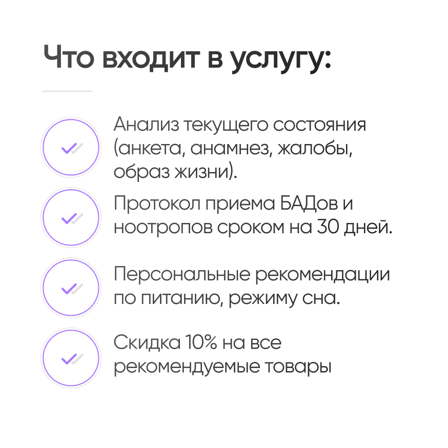 Консультация по биохакингу поможет вам выбрать эффективные стратегии для оптимизации работы организма, улучшения когнитивных функций и повышения продуктивности.