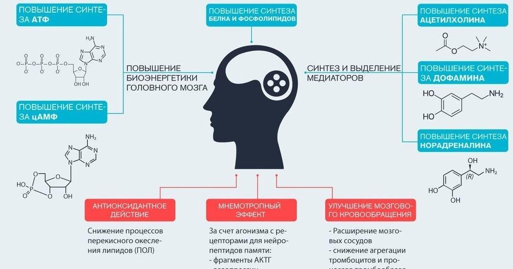 Препарат отличается заметным адаптогенным действием, работает на увеличение быстроты реакции и мозговой деятельности. Импортный нейрометаболит применяется и у пожилых пациентов, страдающих заболеваниями нервной системы, а также дегенеративными патологиями, например, болезнью Альцгеймера или Паркинсона, и других неврологических нарушениях памяти, внимания.