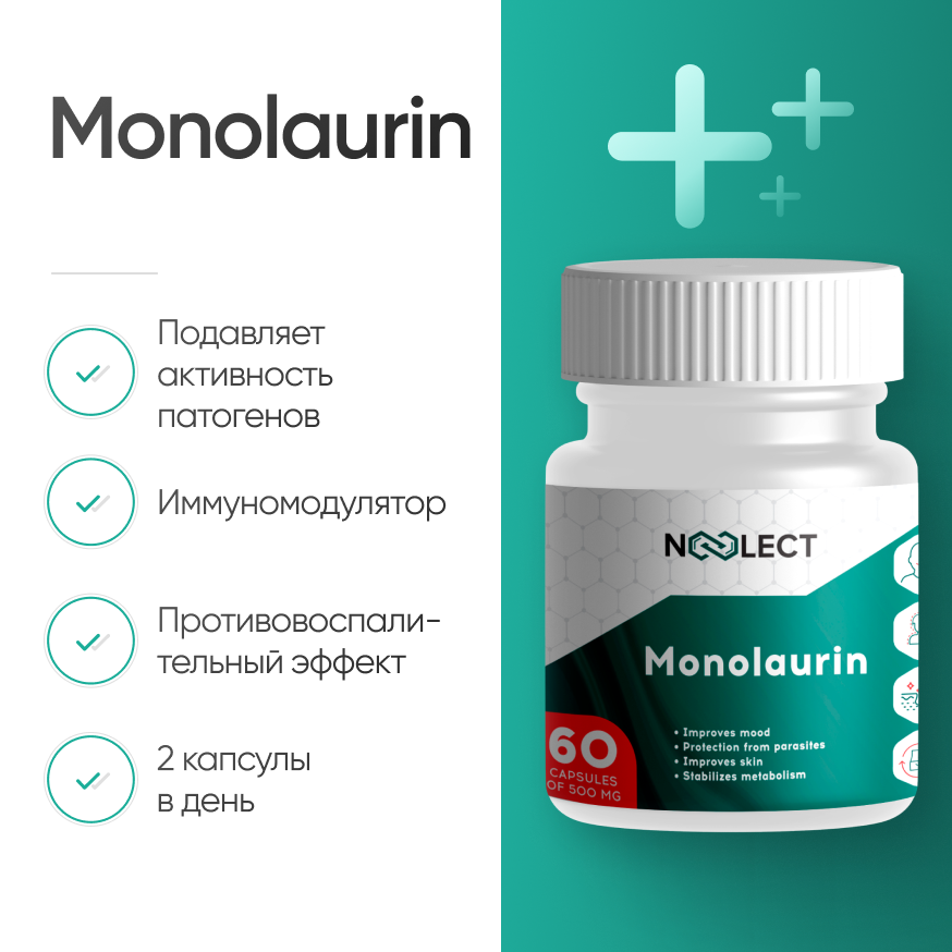 Наиболее популярной считается рекомендация врачей использовать указанную биодобавку в качестве средства для борьбы с различными инфекциями. Monolaurin эффективен против вирусов гриппа, герпеса, ВИЧ, кори и краснухи, он препятствует проникновению инфекции в здоровые клетки. В борьбе против микробов, бактерий и грибков монолаурин тоже хорошо проявляет себя — проникает внутрь патогенных микроорганизмов и разрушает их. Помимо этого, прием монолаурина приносит пользователю следующие преференции: